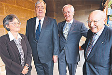 ICAC chief Jerrold Cripps, second from left, with former commissioners Irene Moss, Ian Temby and Barry O'Keefe yesterday. Picture: James Croucher